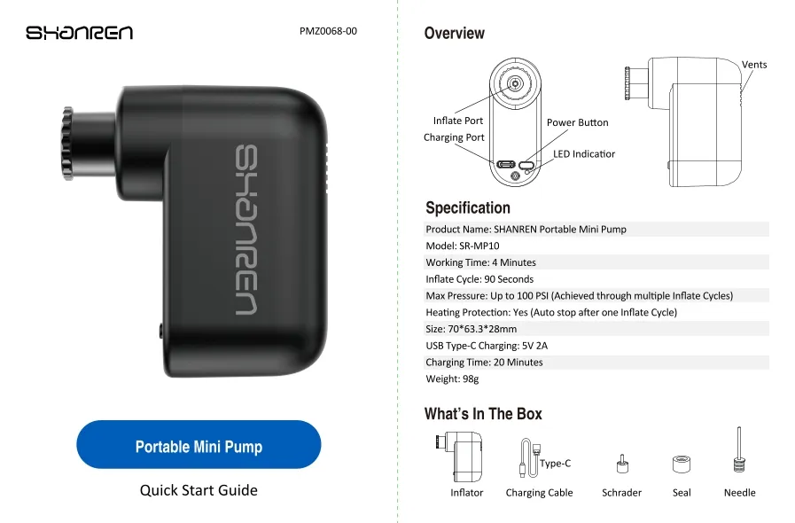 Comes with USB charging cable, Schrader valve adapter, spare seal and a needle (for Rugby or soccer balls)